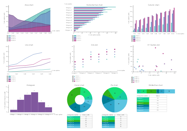 Graphs and charts, vertical bar chart, column chart, serial line chart, line graph, scatter plot, XY chart, pie chart, horizontal bar chart, histogram, dot plot, scatter plot, donut chart, ring chart, divided bar chart, checkbox, area chart,