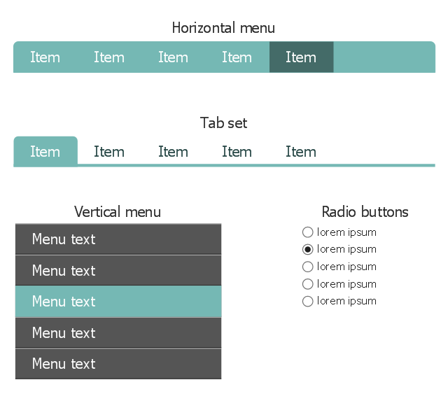 The vector stencils library "BI navigation" contains 4 graphical gontrols: horizontal and vertical menus, radio buttons and tab set.