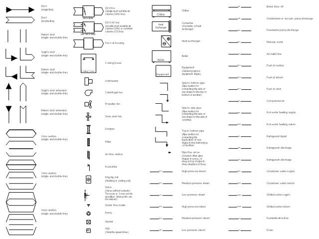 HVAC control equipment symbols, water flow meter, vane axial fan, pitch control, valve, unit heater, supply duct, return duct, refrigerant liquid, refrigerant discharge, pump, propeller fan, pipe flow arrow, pipe, multi fan section, medium-pressure steam, medium-pressure return, makeup water, magnetic, starter, low-pressure steam, low-pressure return, humidifier, humidification line, hot water heating supply, hot water heating return, high-pressure steam, high-pressure return, heating, cooling, coil, heat exchanger, plate and tube, fuel oil vent, fuel oil suction, fuel oil return, filter, feedwater pump discharge, fan coil housing, equipment, duct extension, duct, drain, damper, cooling tower, converter, condenser water supply, condenser water return, condensate or vacuum pump discharge, compressed air, chiller, chilled water supply, chilled water return, centrifugal fan, boiler blow off, boiler