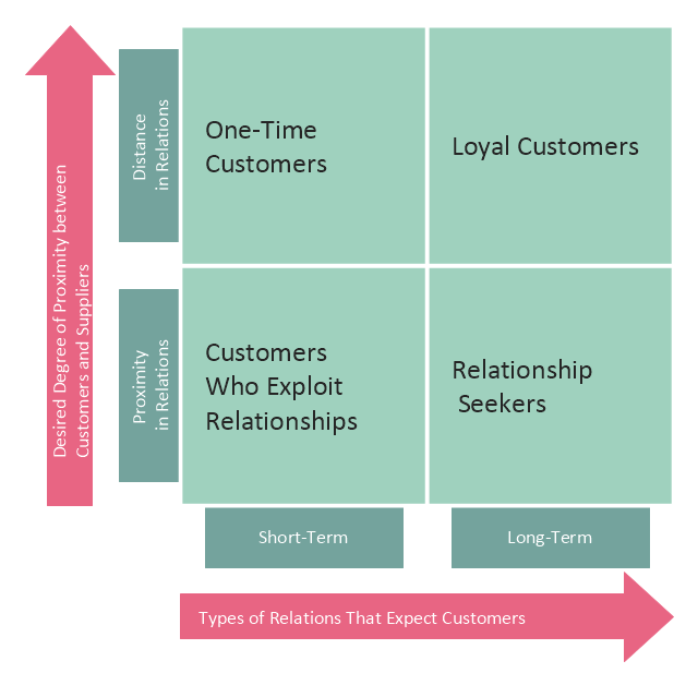 This customer types matrix diagram distribute customers into four categories depending of two criteria: 1) desired degree of proximity between customers and suppliers, and 2) types of relations that expect customers. One time customers have short-term relations with suppliers and characterized by distance in relations with them. Loyal customers have long-term relations with suppliers and characterized by distance in relations with them. Customers who exploit relationships have short-term relations with suppliers and characterized by proximity in relations with them. Relationship seekers have long-term relations with suppliers and characterized by proximity in relations with them. This customer types matrix diagram example was created using the ConceptDraw PRO diagramming and vector drawing software extended with the Matrices solution from the Marketing area of ConceptDraw Solution Park.