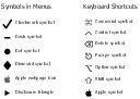 UI elements, shift symbol, keyboard shortcuts, option symbol, keyboard shortcuts, menu symbol, checkmark, menu icon, Apple webpage icon, escape symbol, dot menu symbol, disclosure triangle, diamond menu symbol, delete symbol, keyboard shortcuts, dash menu symbol, control symbol, keyboard shortcuts, command symbol, keyboard shortcuts, Apple symbol, keyboard shortcuts,