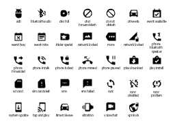 System icons of notifications, vpn lock icon, voice chat icon, vibration icon, time to leave icon, tap and play icon, system update icon, sync problem icon, sync icon, sync disabled icon, sms icon, sms failed icon, sim card alert icon, sd card icon, play install icon, play download icon, phone paused icon, phone missed icon, phone locked icon, phone in talk icon, phone forwarded icon, phone bluetooth speaker icon, network locked icon, more icon, folder special icon, event note icon, event busy icon, event available icon, drive eta icon, do not disturb icon, dnd forward slash icon, disc full icon, bluetooth audio icon, adb icon,