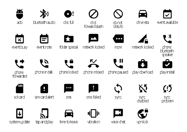 The vector stencils library "Android system icons - notification" contains 34 system icons of notifications. Use this icon set to design user interface of your Android application. The icons example "Design elements - Android system icons (notification)" was created using the ConceptDraw PRO diagramming and vector drawing software extended with the "Android 5 UI" solution from the "Software Development" area of ConceptDraw Solution Park.