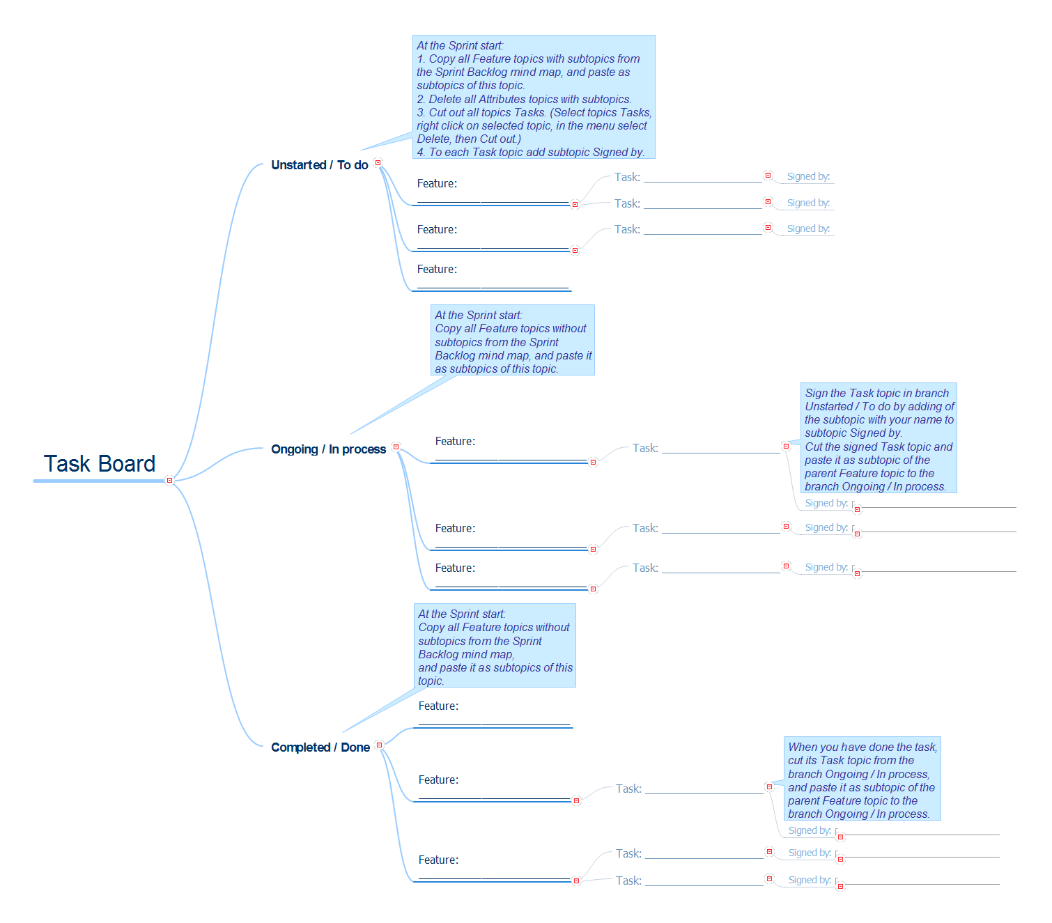 Scrum is a widely used Agile framework for completing the complex projects. Originally invented for software development teams, it is now successfully applied for any innovative scope of work and any business industry. The Task board is an integral part and the most popular tool of the Scrum method. It is a simple, but powerful tool that is usually represented as a table consisting of rows and columns. The Task board contains the columns To Do, Work In Process, To Verify, Done and the set of tasks, each task starts at the To Do column. So, each team participant can see at a glance on a Task board which tasks are currently in work and which are already completed. The Task board reflects the current status of the project and moreover lets detect the problem situations, and then take promptly the needed measures. ConceptDraw MINDMAP software offers the powerful tools to depict the Task board in a form of Mind Map, to visualize Agile management methodologies Scrum and Kanban, and their hybrid Scrum-ban.The vector stencils library "Scrum workspace" contains 21 icons.