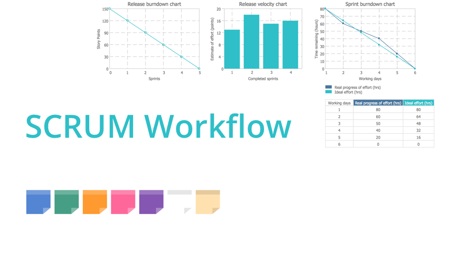 The Scrum Workflow Solution extends the capabilities of ConceptDraw DIAGRAM with a large collection of professionally-designed samples and a selection of ready-to-use scrum design elements: scrum diagrams and arrows, scrum icons of people, artifacts, workflow, workspace and other colorful scrum clipart, and also scrum charts.