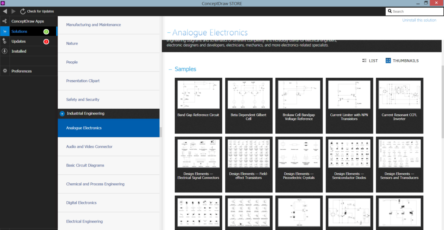ConceptDraw DIAGRAM software and ConceptDraw STORE provide the Analog Electronics solution with powerful drawing tools and 7 libraries with a collection of special symbols and pictograms: