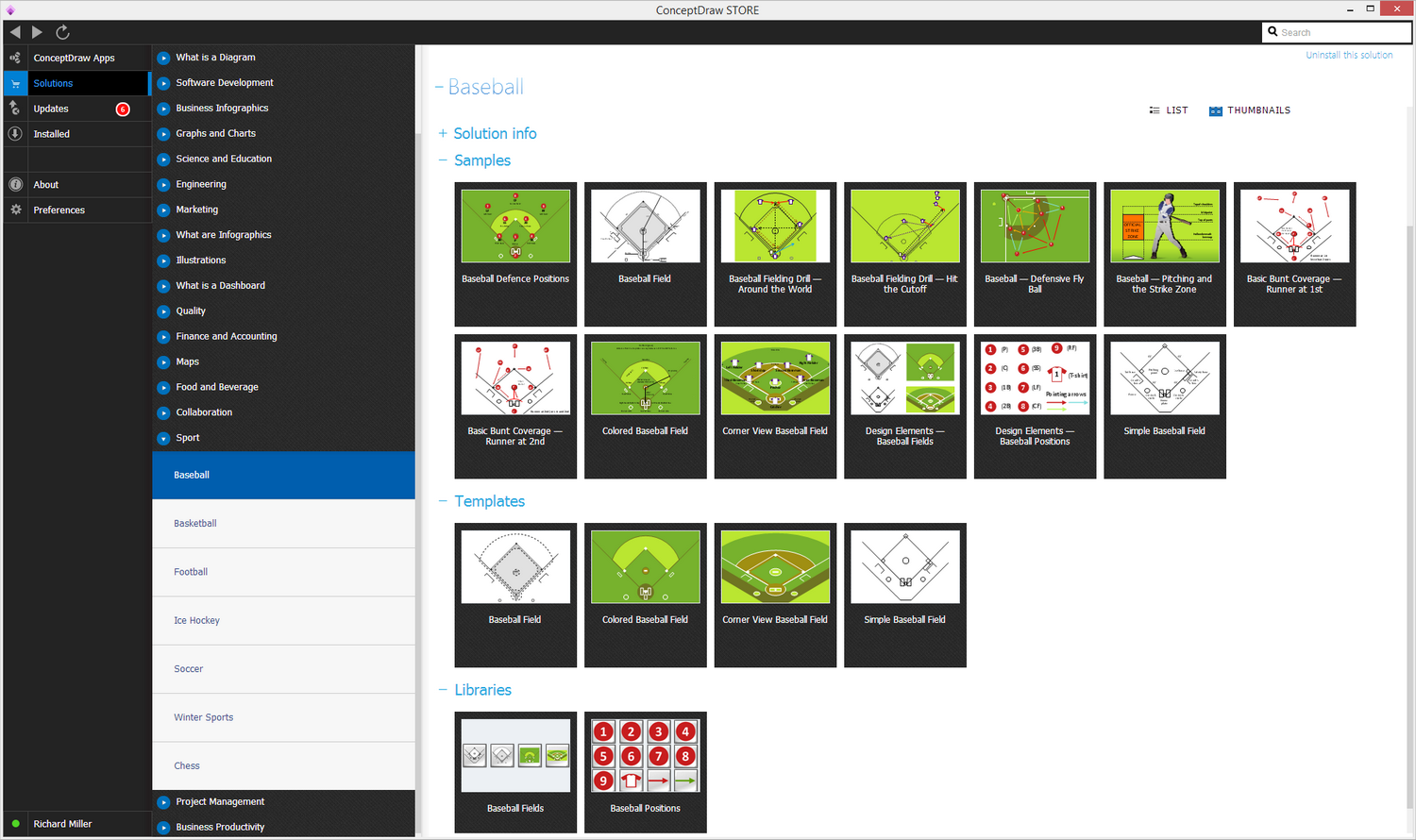 ConceptDraw DIAGRAM software extended with the Baseball solution provides access to the stencil libraries, templates and samples which can allow ConceptDraw DIAGRAM users to create the baseball diagrams and schemes. Fields objects were designed in accordance with the real fields dimensions. A set of fields samples includes all of the needed dimensions and all of the plays and positions diagrams are available for all of the ConceptDraw DIAGRAM users having this great and useful solution.