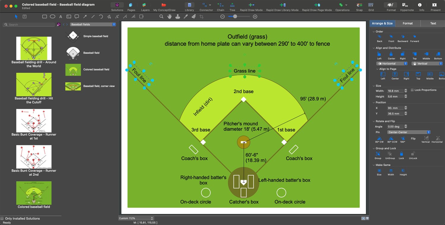 A combination of the "Baseball Fields" and "Baseball Positions" libraries gives you an ability to create a baseball-related drawing in seconds. Follow the next steps to create your own baseball schema or baseball field layout diagram: