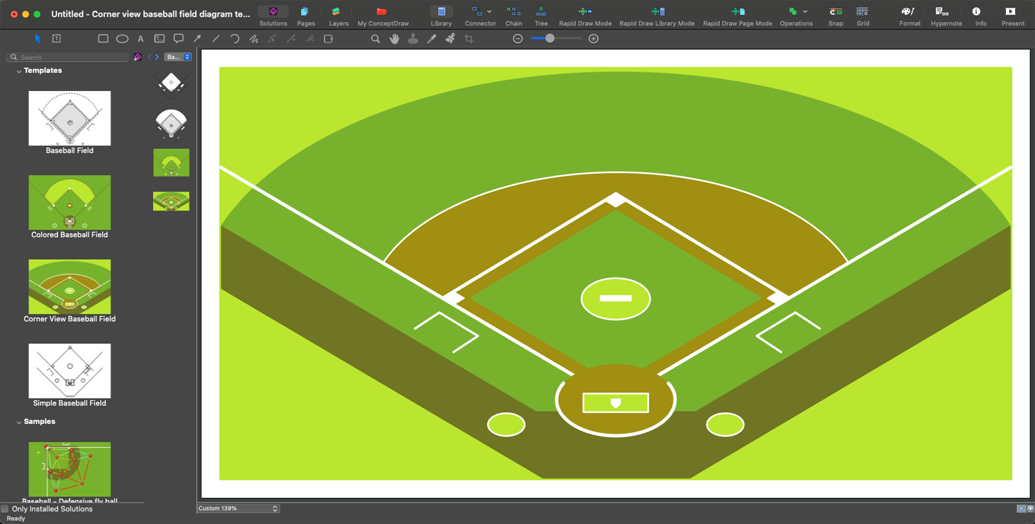In case you need software that allows using the pre-made stencils and the samples, then ConceptDraw DIAGRAM is the best choice for this case. A combination of the "Baseball Fields" and "Baseball Positions" libraries gives you an opportunity to create baseball field layout and positions diagram and other baseball-related drawings in only a few hours or even minutes, so it is always beneficial to have this application on your desktop and the needed solution for making different plans of the baseball field, including the corner view of the baseball field.
