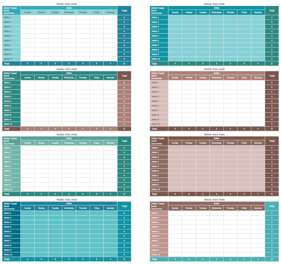 Thus, “Cause and Effect Diagram stencil library” from the “Seven Basic Tools of Quality” solution provides design elements for creating any needed “cause-and-effect”, or “fishbone” diagram. “Check Sheet” library includes colourful weekly check sheets. “Control Chart library” provides the examples of the control charts. “Histogram” one — histograms. “Pareto Chart library” shows the samples of Pareto Charts which all can be used as drafts for making the unique great looking as well as professionally looking charts. Process Flowchart Library allows all ConceptDraw DIAGRAM users to apply any needed design symbol to their drawings of Process Flowcharts for representing “Decision”, “Delay”, “Off-page reference”, “Document”, “Input-Output”, “Process Step”, “Alternate symbol for start or end points”, “Flown direction line”, etc. Run Chart, Scatterplot and Stratification Diagram libraries include the templates of the mentioned drawings that can be also used as examples as well as drafts.