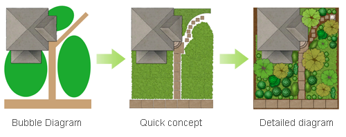 The main advance of the bubble diagrams is the simplicity of their creation. It lets you to create several variants of design in a short period of time and without hard work and choose the best from them. Don’t forget that you don’t need to concentrate on the small details of the future landscape — just use your imagination for creation the best concept, which will be obvious from the created bubble diagrams.