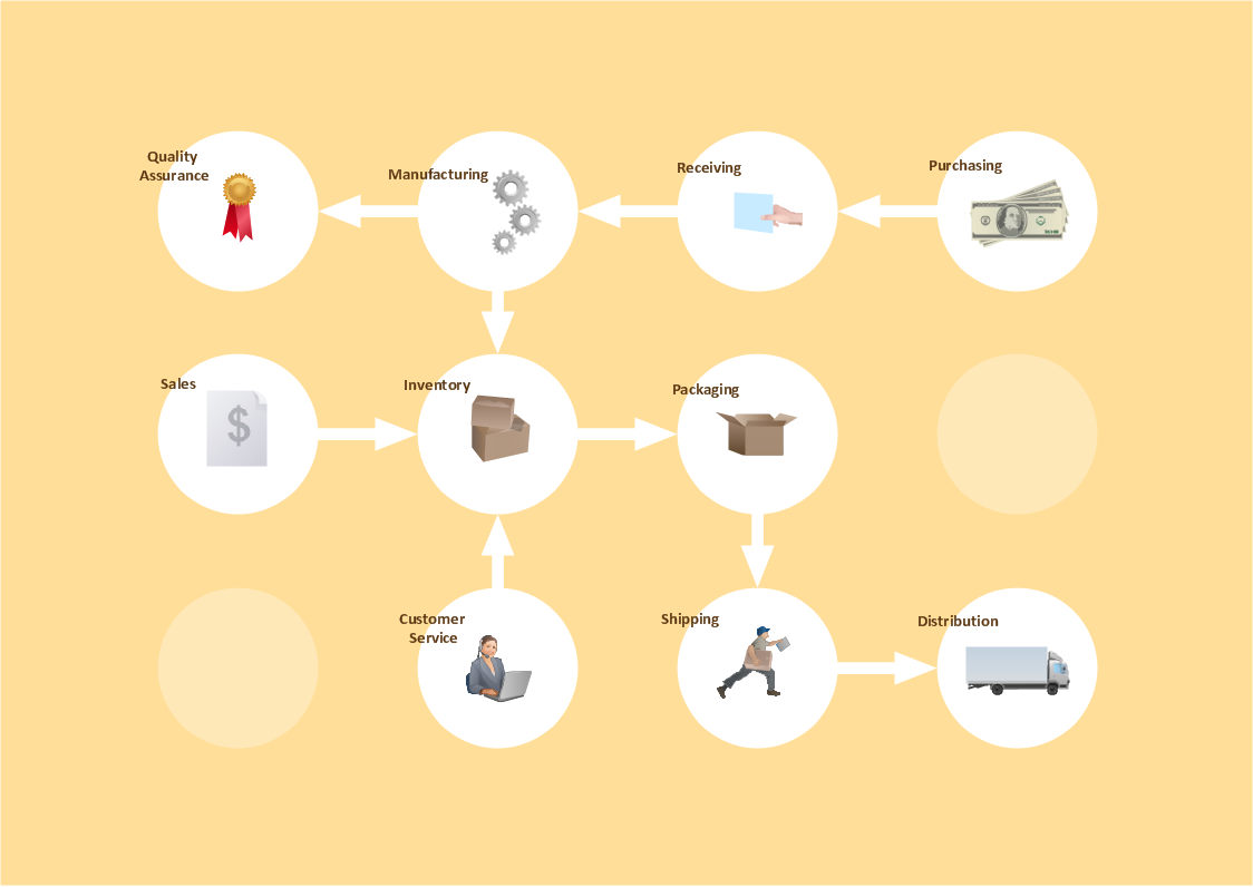 The weaknesses of BPMN can relate to support for routine work, confusion and ambiguity in sharing BPMN models, support for knowledge work and support for decision-making business rules. Despite of the mentioned weaknesses, the Business Process Models are very widely used, especially in a way of the business process workflow diagrams, using the ConceptDraw DIAGRAM business process workflow diagrams software, that works on Mac providing the design objects as well as the pre-made examples of already existing business process workflow diagrams, such as the one, explaining the business process of purchasing the goods, when the money’s received and the manufacturing process takes place, getting through quality assurance to make sure that the final product is good enough for the customer. Going through “inventory” stage, the goods appear to be packed and shipped to the customer. The distributing process can involve logistic procedures, such as storing the produced goods at the warehouses and delivering them locally. In case the goods go abroad, they might be checked as the customs clearance point, but after being confirmed as safe at the customs and after paying all taxes, they can be simply taken by the client if he prefers to pick them up himself, meeting the requirements of his contract with the shipper.