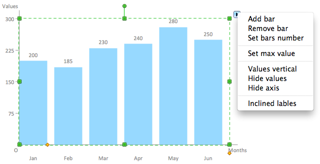 - To change bar width and space between bars select the bar chart and use control dot on the horizontal axis.