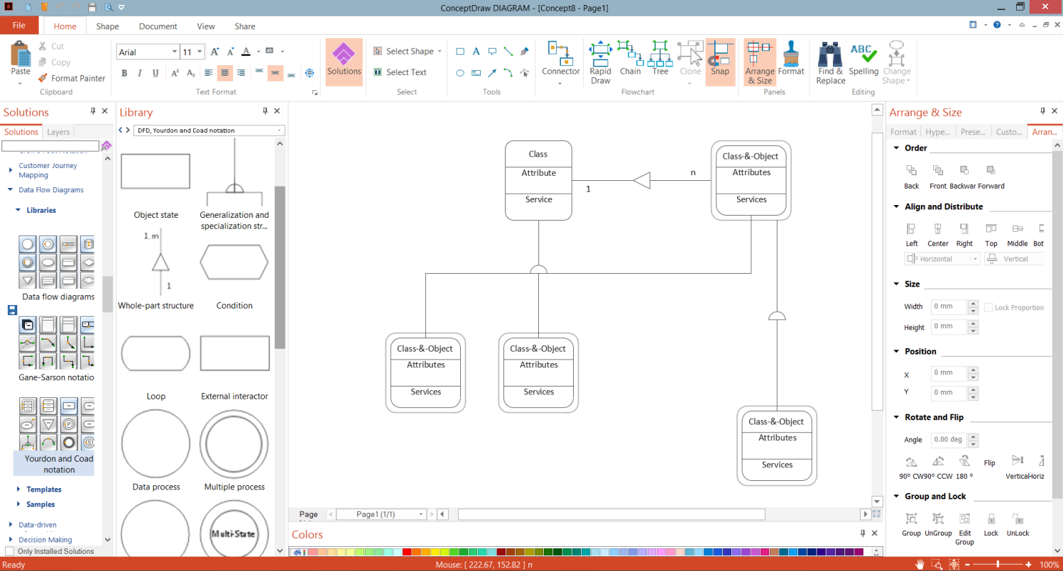 - ConceptDraw DIAGRAM provides you the possibility to use the grid, rules, and guides. You can easily rotate, group, align, arrange the objects, use different fonts and colors to make your diagram exceptionally looking.