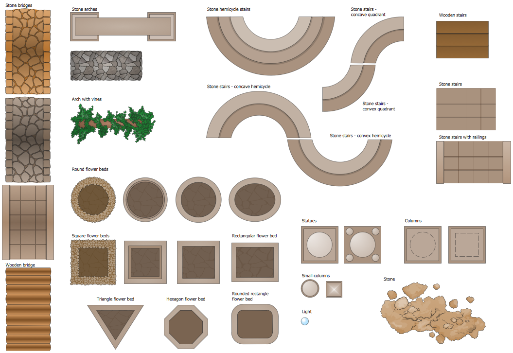 Landscape & Garden solution offers a collection of pre-made samples and examples of landscape and patio designs, and a wide variety of libraries with ready-to-use vector design elements — dimensioning, garden paths, walkways elements, ponds, fountains, bushes, trees, flowers, topiary, hedges, recreational equipment, garden accessories and furniture, patios, plots, fences, and many more details for your exceptional designs.