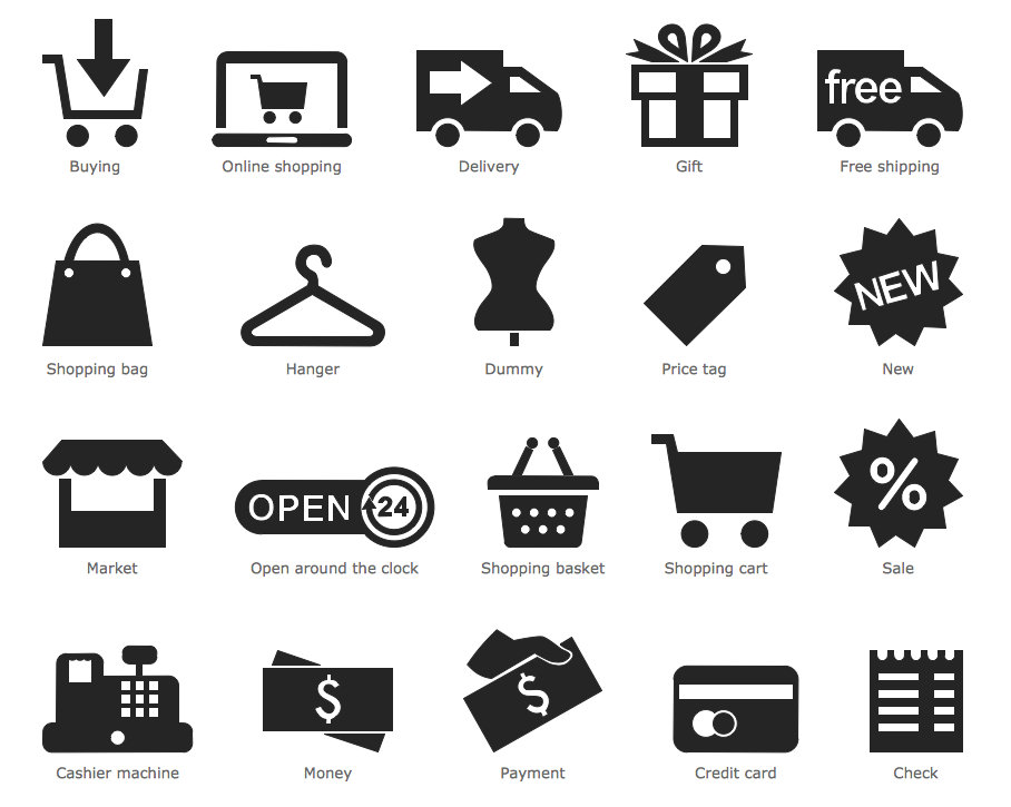 Use the Shopping Pictogram library from the Pictorial Infographics solution with 20 shopping-related vector pictograms for your shopping and commerce activities.