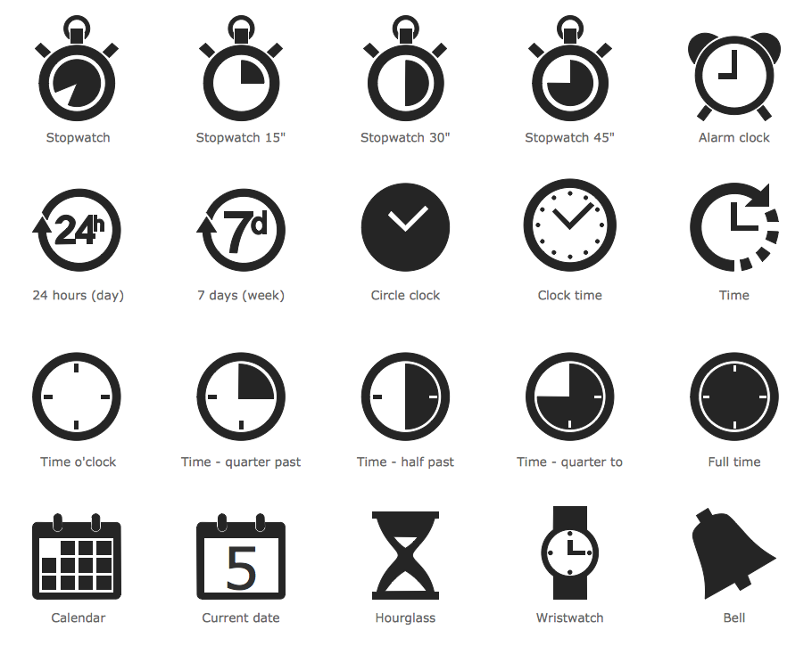 The Time and Clock Pictograms library from the Pictorial Infographics solution contains 20 vector clock pictograms that can be applied literally everywhere.