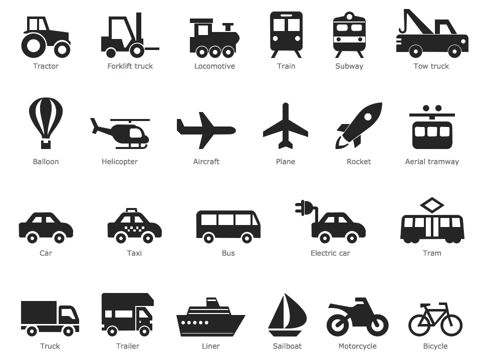 Using the Transport Pictograms library from the Pictorial Infographics solution with 23 vector pictograms of various transport you can create the illustrated thoroughfare schemes, maps, etc.