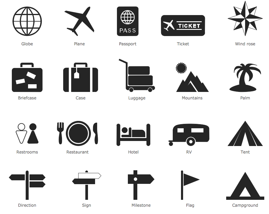 The Travel and Tourism Pictograms library from the Pictorial Infographics solution that contains 20 travel-related vector pictograms is simply irreplaceable for tourist companies and agencies.