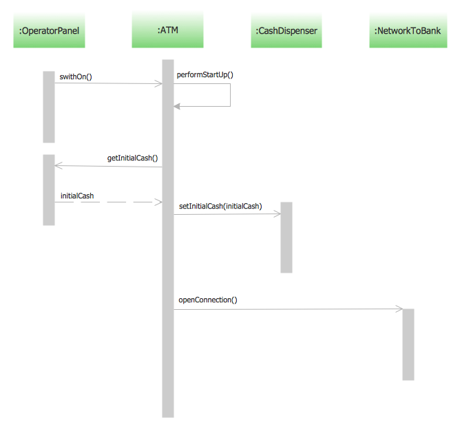 Sequence UML for ATM - This sample represents the UML Sequence Diagram of working the ATM (Automated Teller Machine) banking system. On this diagram are represented the processes and objects that occur at the same time as lifelines (parallel vertical lines), and the messages exchanged between them as horizontal arrows. This sample can be used by the banks for service of the banking transactions using ATMs.