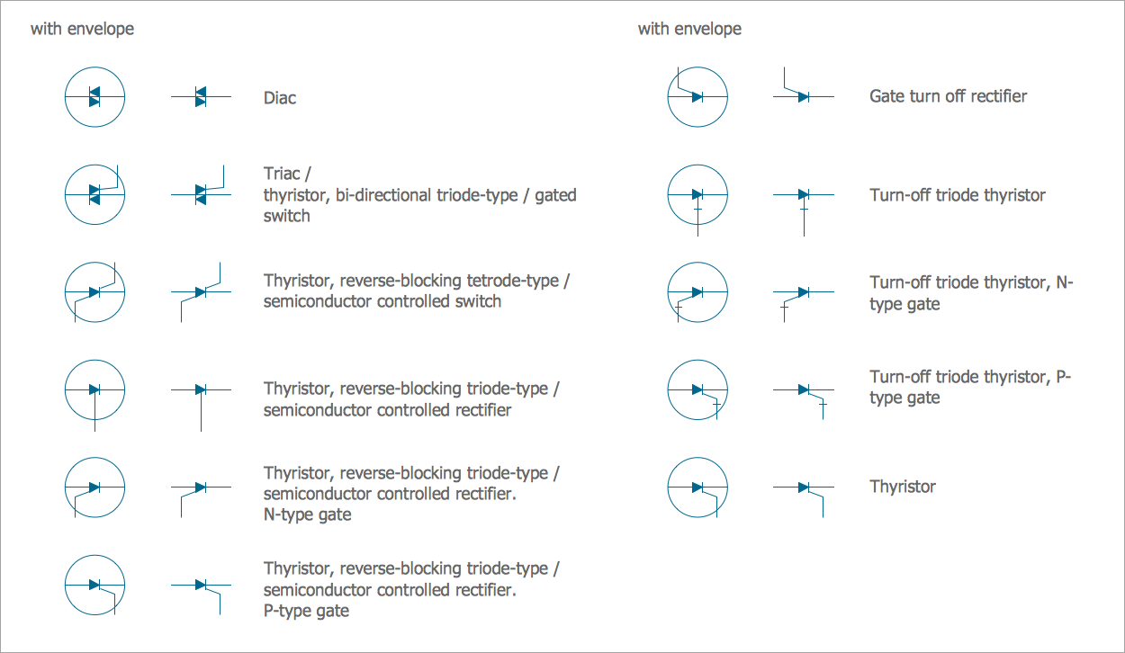 Semiconductors library contains 22 electrical symbols of rectifiers, diodes, charge transfer and electronic conduction devices, switches, cathodes, transistors, thyristors, and transceivers for semiconductor (SIS) design using professional program for wiring diagrams.