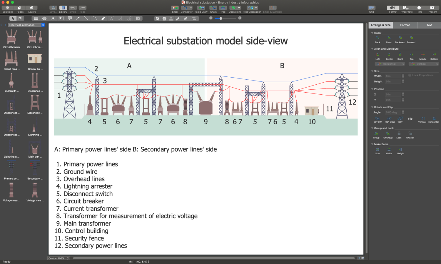 The Electrical Substation Diagram you see on this page was made using the vector stencil libraries from the Energy Industry Infographics Solution for ConceptDraw Solution Park. An experienced user spent 10 minutes creating this sample.