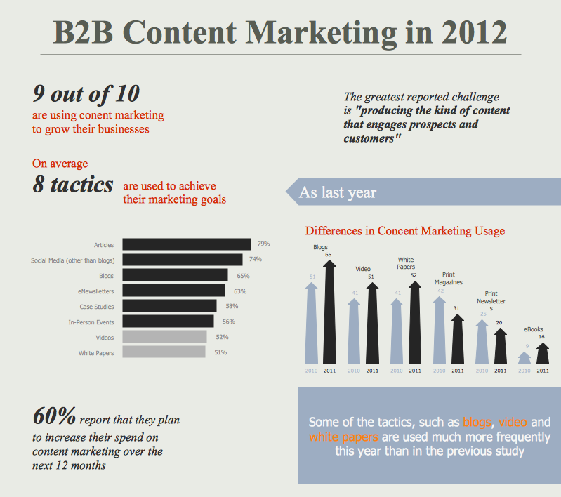 The popularity of visual content marketing grows day by day. So now simple and convenient designing of professional looking Content Marketing Infographics becomes increasingly actual. For achievement this goal ConceptDraw DIAGRAM software offers the Marketing Infographics Solution from the Business Infographics Area.