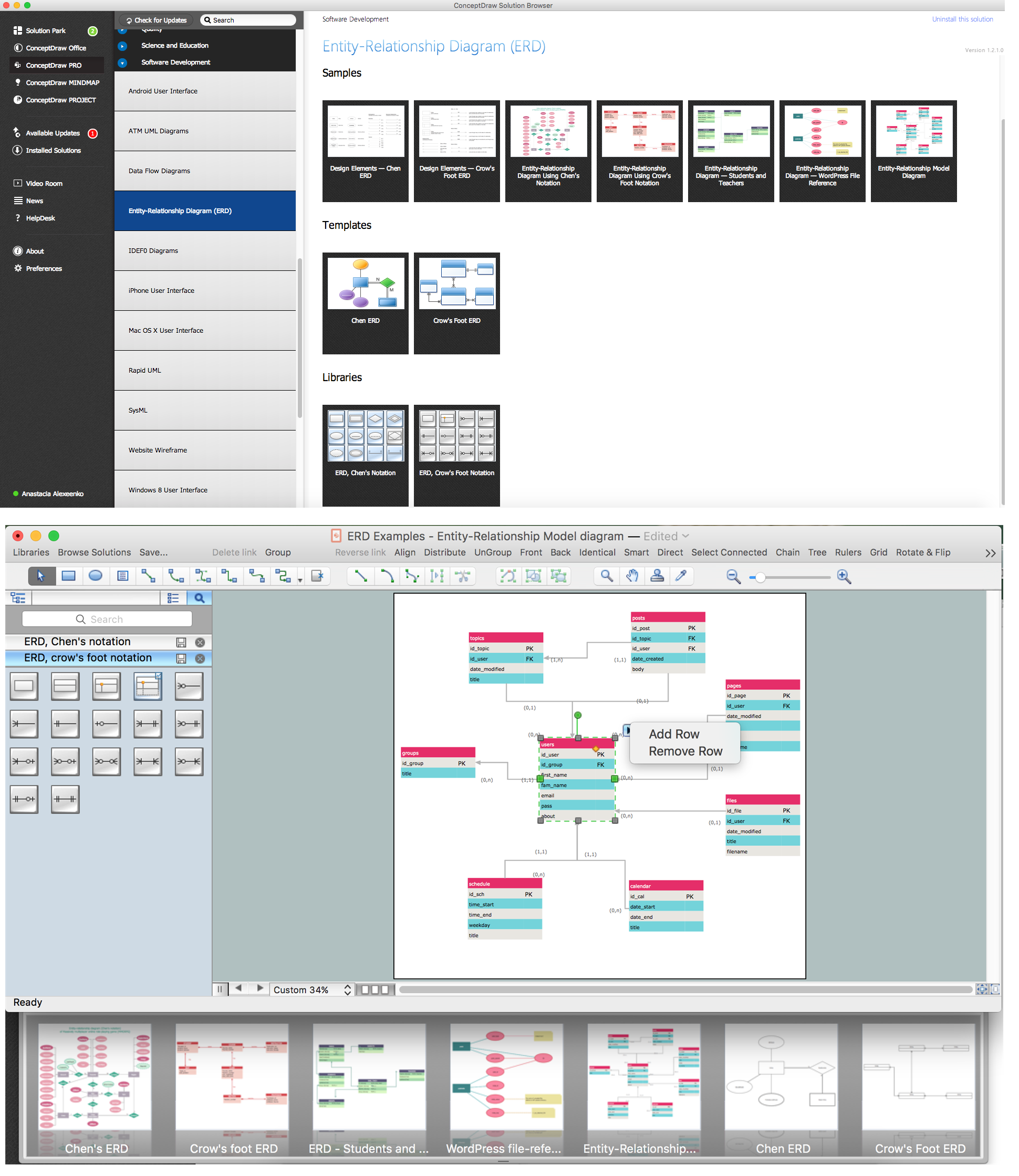 The Entity-Relationship Diagram (ERD) solution from ConceptDraw Solution Park extends ConceptDraw DIAGRAM ector graphics and diagramming software with the ability to draw your own entity relationship diagrams using Chen's or Crow's Foot notations applying 2 libraries with numerous predesigned ER icons: