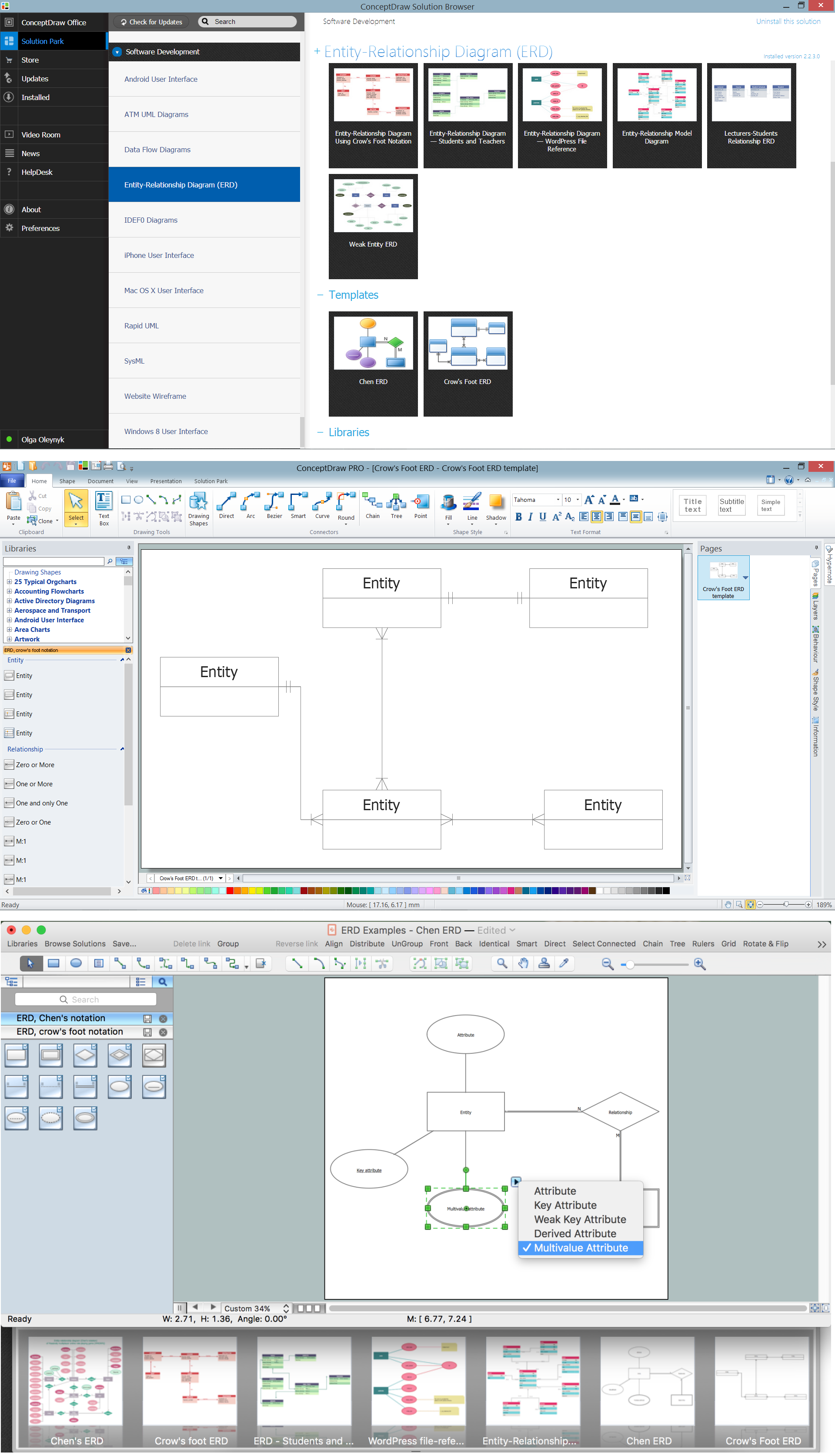 ConceptDraw DIAGRAM compatible Mac OS X software extended with powerful Entity-Relationship Diagram (ERD) Solution from the Software Development Area for ConceptDraw Solution Park is one of the famous ER Diagram Programs for Mac. It gives the perfect ability to draw ER diagrams for visually describing databases with Chen's and Crow's Foot notation icons.