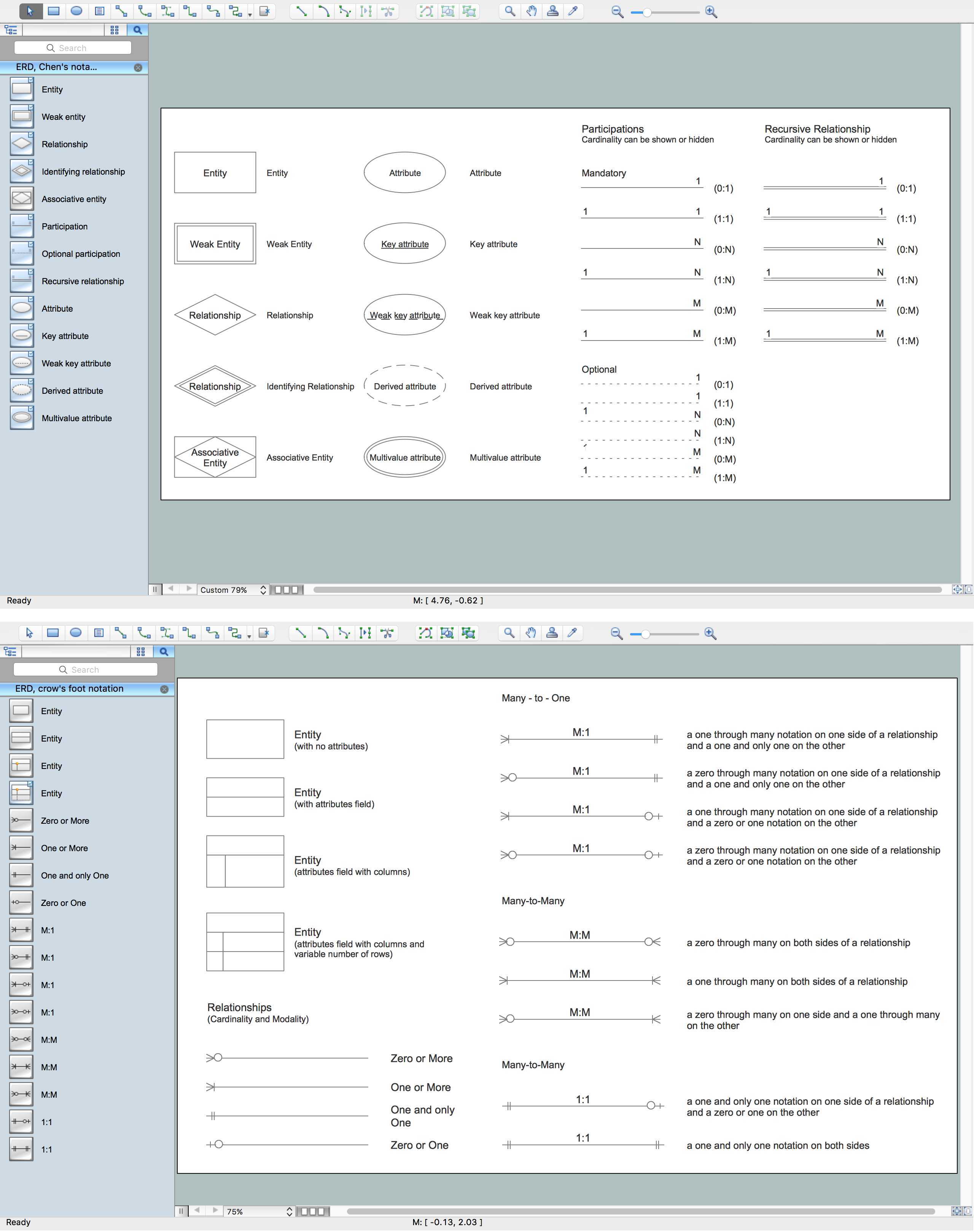 Entity-Relationship Diagram (ERD) Solution offers two libraries with large quantity of vector objects helpful for design the ER diagrams using Chen′s or Crow′s Foot notations: