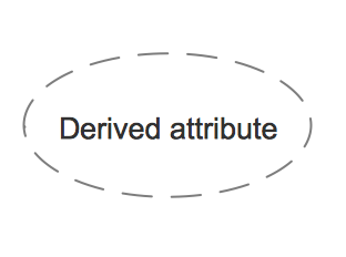 Derived attribute | An attribute whose value is calculated (derived) from other attributes. The derived attribute may or may not be physically stored in the database. In the Chen notation, this attribute is represented by dashed oval. |