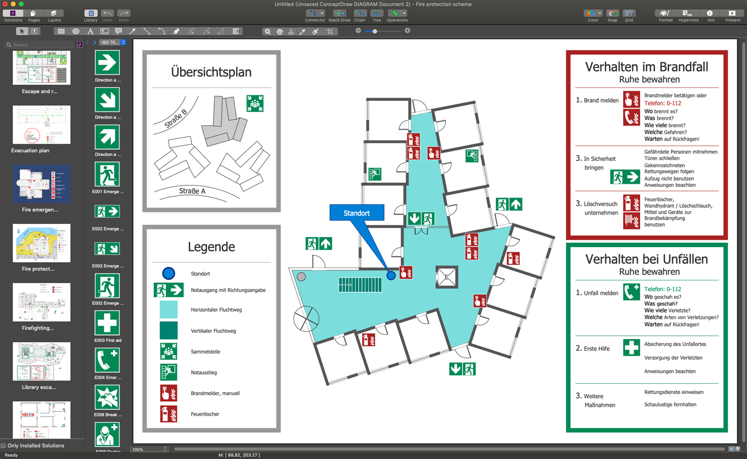 As for the plan, ConceptDraw Diagram software allows you the best way to prepare for any emergency. It proposes professional tools for construction a detailed Evacuation Floor Plan, Emergency Exit Plan, or Rescue Plan. Being extended with Fire and Emergency Plans solution it includes a large collection of predesigned vector design objects on the emergency thematic. They are grouped into three libraries. The solution also contains a set of multifarious examples and samples.