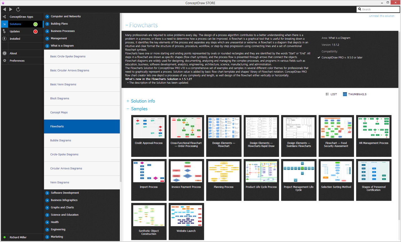 ConceptDraw STORE is the best for easy navigation through a ConceptDraw Solution Park. It gives the quick access to all libraries, templates and samples directly from it.