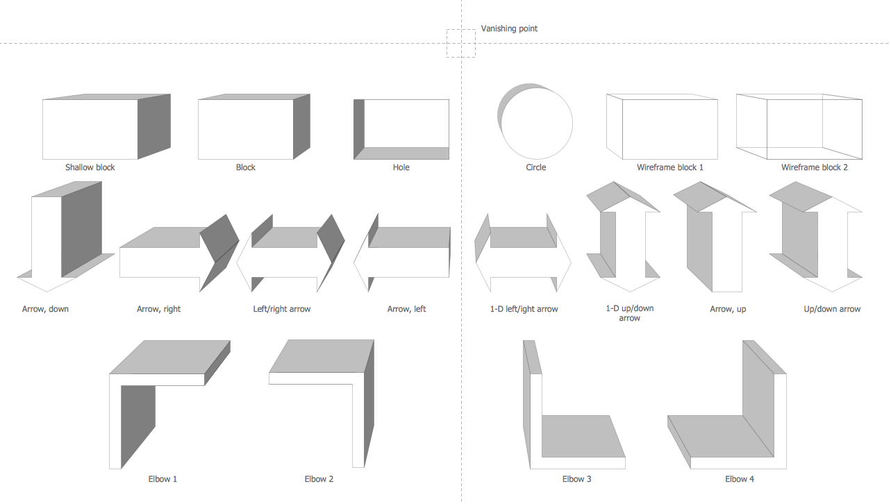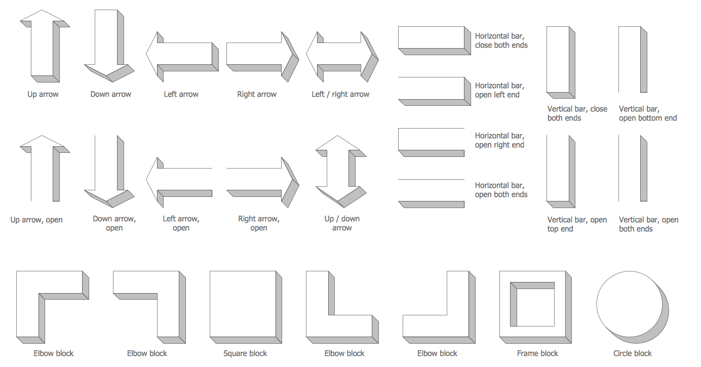 There are all together 5 libraries which contain 190 vector stencils in the Block Diagrams solution, which can be downloaded both from ConceptDraw STORE or from this site. Another stencil library is called Blocks with Perspective one and it includes such design symbols, as Up arrow, Down arrow, Left arrow, Right arrow, Left/right arrow, Horizontal bar, closed both ends, Horizontal bar, open left end, Horizontal bar, open right end, Horizontal bar, open both ends, Vertical bar, close both ends, Vertical bar, open bottom end, Vertical bar, open top end, Vertical bar, open both ends, Up arrow, open, Down arrow, open, Left arrow, open, Right arrow, open, Up/down arrow, Elbow block, Square block, Frame block, Circle block and other.