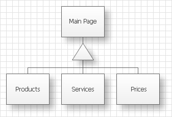 Pay attention that the page on the diagram should correspond to the page displayed on the resource at browsing even if it consists of several HTML files or frames. On the contrary, files are only files which just displayed on the resource as links (downloaded documents, audio or video files, programs and so on) or simply used at the resource work, for instance background music and data base. For indication of the group of pages of similar meaning (E.g. a catalogue of the production types) or the group of files (set of documents for downloading) use elements pagestack and filestack. You can use any convenient for you way of indication of concrete diagram elements- text signs and alphanumeric indications. Connections between elements on the diagram are represented as simple lines. As a rule, the diagram is constructed in the form of a tree as the usual web-resource has the treelike structure (start or main page on which links to other pages are located) however this way of representation is not obligatory. If on the diagram there are represented variants of usage of a resource by a user at the execution of different tasks and in the presence of definite access rights, then you can use different kinds of arrows to show the direction of user’s movement on the resource and elements inaccessible for this user.