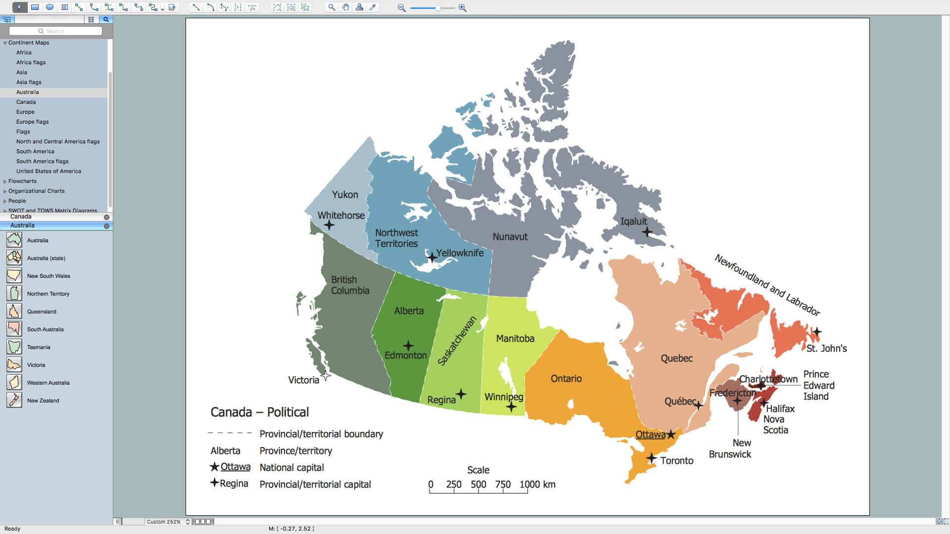 There might be a need for you to draw a map of Canada or Nova Scotia in particular as well as other provinces separately or all together mentioning the population, the area of each province or you might want to create a politic map of this country or its province. It is simple to do it all having a great and very convenient application which is CS Odessa’s product – ConceptDraw DIAGRAM Having this software means having the opportunity to create any needed map as all of the necessary tools are there available for you both in ConceptDraw DIAGRAM as many more in ConceptDraw STORE, which is another application, developed by the professionals of CS Odessa for providing all of the necessary “solutions” containing stencil libraries as well as samples and templates.