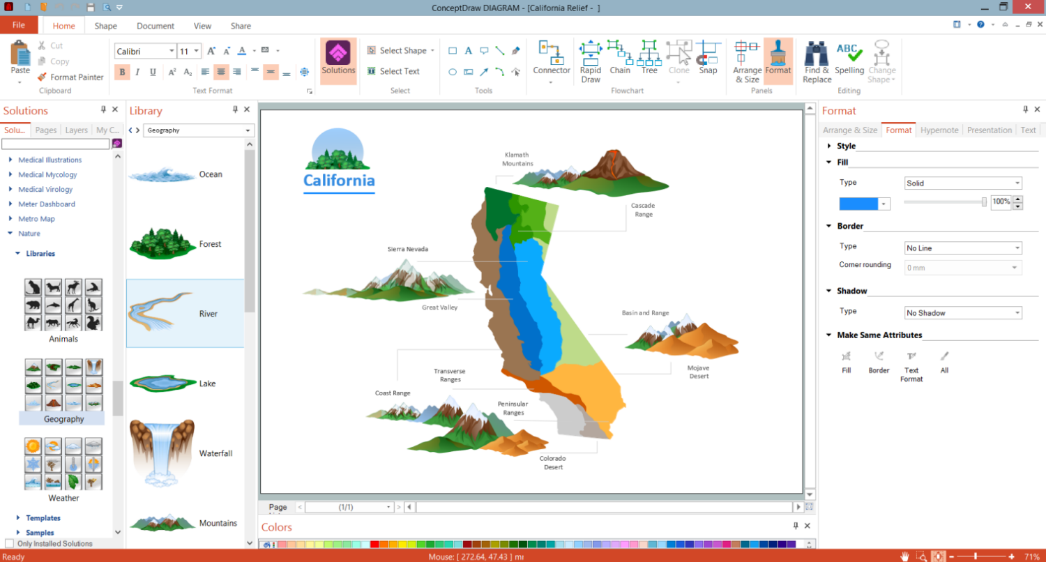 ConceptDraw DIAGRAM software offers a wide range of powerful built-in drawing tools and fully customizable user interactions for geographical data visualization. The Nature solution from the Illustration area, Continent Maps solution, and other solutions from the Maps area are useful for gathering insights and creating informative geographical visualizations for different areas. They include a large collection of pre-made vector design elements and pictorial samples. The parts and regions can differ with colors on the map. The important data, values, and geographic patterns are usually highlighted with bright colors to attract the attention of the audience.