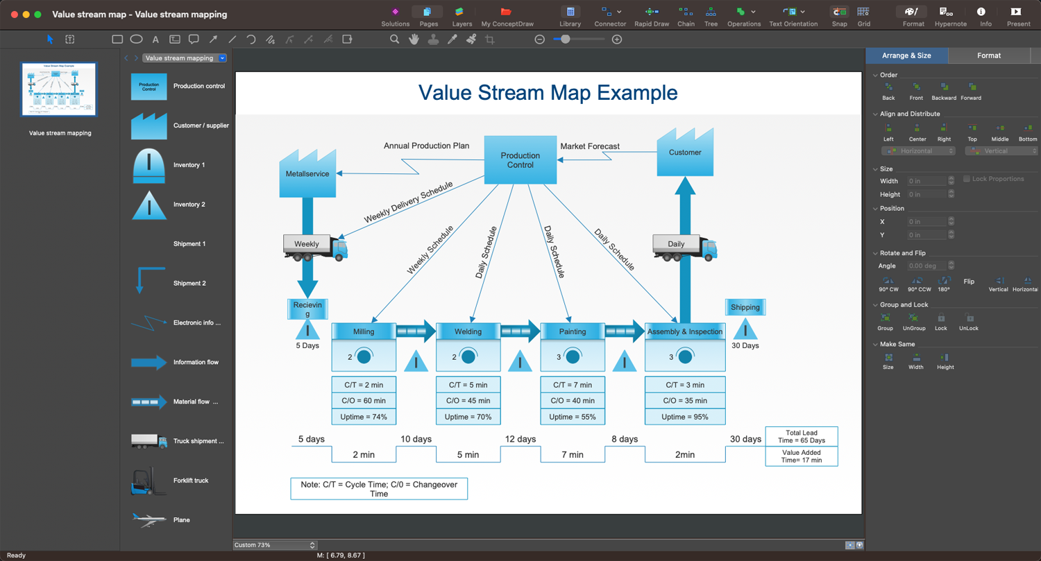 Value Stream Mapping solution for ConceptDraw DIAGRAM software provides a set of illustrative Value Stream Mapping examples and samples. They help to observe solution capabilities and power, and how to create a Value Stream Map easily. The included examples can be customized similarly to the pre-made templates, also included in the solution. The ready sample or template is a good starting point for drawing your own VSM.