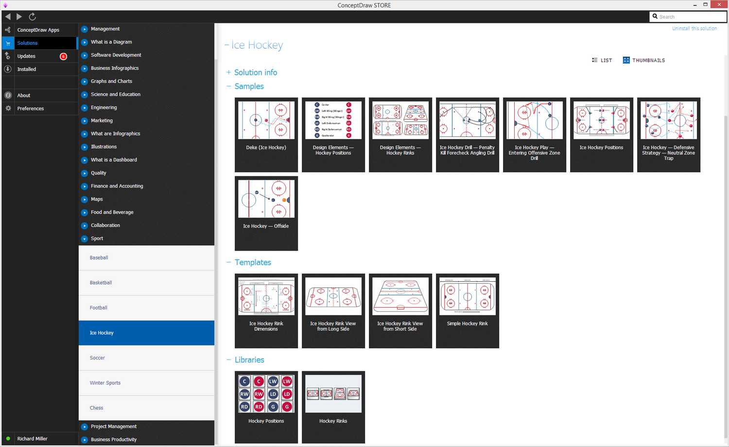 You can always find the mentioned “Ice Hockey” solution from the Sport area of the ConceptDraw STORE application, which is a new product of CS Odessa, enabling all the ConceptDraw DIAGRAM users to make their drawings, such as plans of the sport areas and many other schematics, including charts, flowcharts, diagrams and other schemes, within only a short period of time (usually up to an hour), depending on how good you know both applications — ConceptDraw DIAGRAM as well as ConceptDraw STORE.