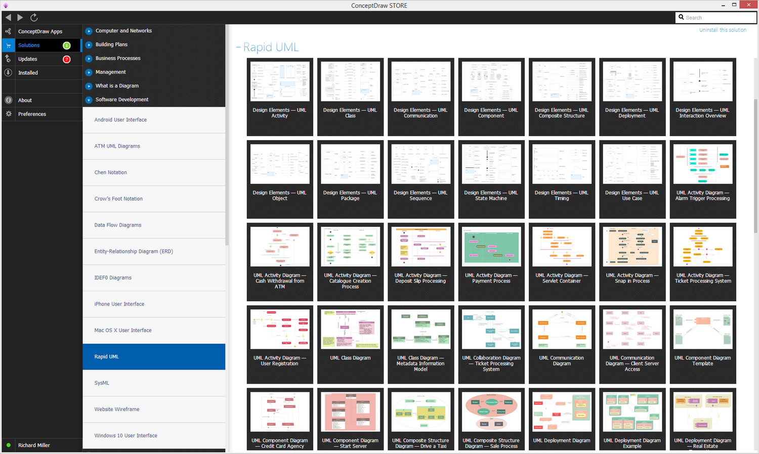 Using ConceptDraw DIAGRAM software for making the previously described in detail use case diagrams is one of the best options available nowadays. The reason of this software being so popular today is that it allows having the examples of already previously created diagrams which all can be used while creating your own ones. For example, if you have no idea of where to start from and what to do in order to make a great looking use case diagram, then you can simply find the template of it in one of the solutions, available for all of the ConceptDraw DIAGRAM users. In this case the “Rapid UML solution” from “Software Development area” of “ConceptDraw Solution Park” from this site can match your needs in the best way. Having it means, apart from having the samples of all pre-made diagrams, getting the vector stencils library “UML Use Case”, which contains the specific design symbols of the UML notation (such as actors, actions, associations and relationships) in order to use while working in the ConceptDraw DIAGRAM diagramming and vector drawing software.