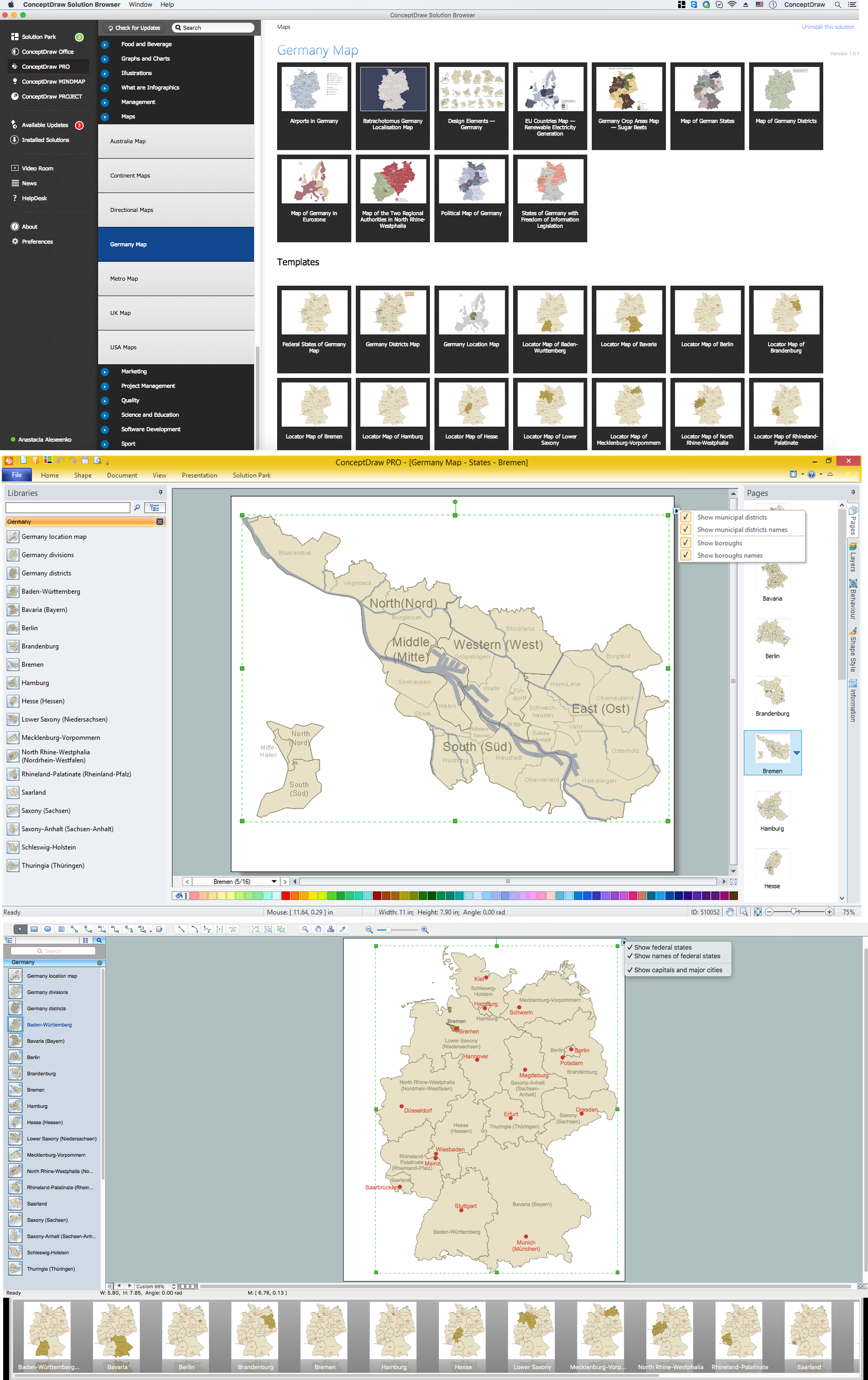 All source documents are vector graphic documents. They are available for reviewing, modifying, or converting to a variety of formats (PDF file, MS PowerPoint, MS Visio, and many other graphic formats) from the ConceptDraw STORE. The Germany Map Solution is available for all ConceptDraw DIAGRAM users.