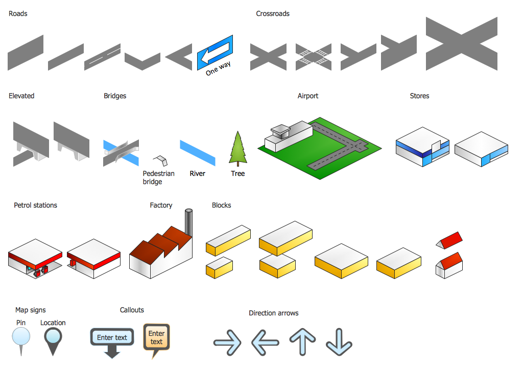 Look at the variety of libraries offered by Directional Maps Solution - 10 libraries with 338 vector shapes. How is it easy design: