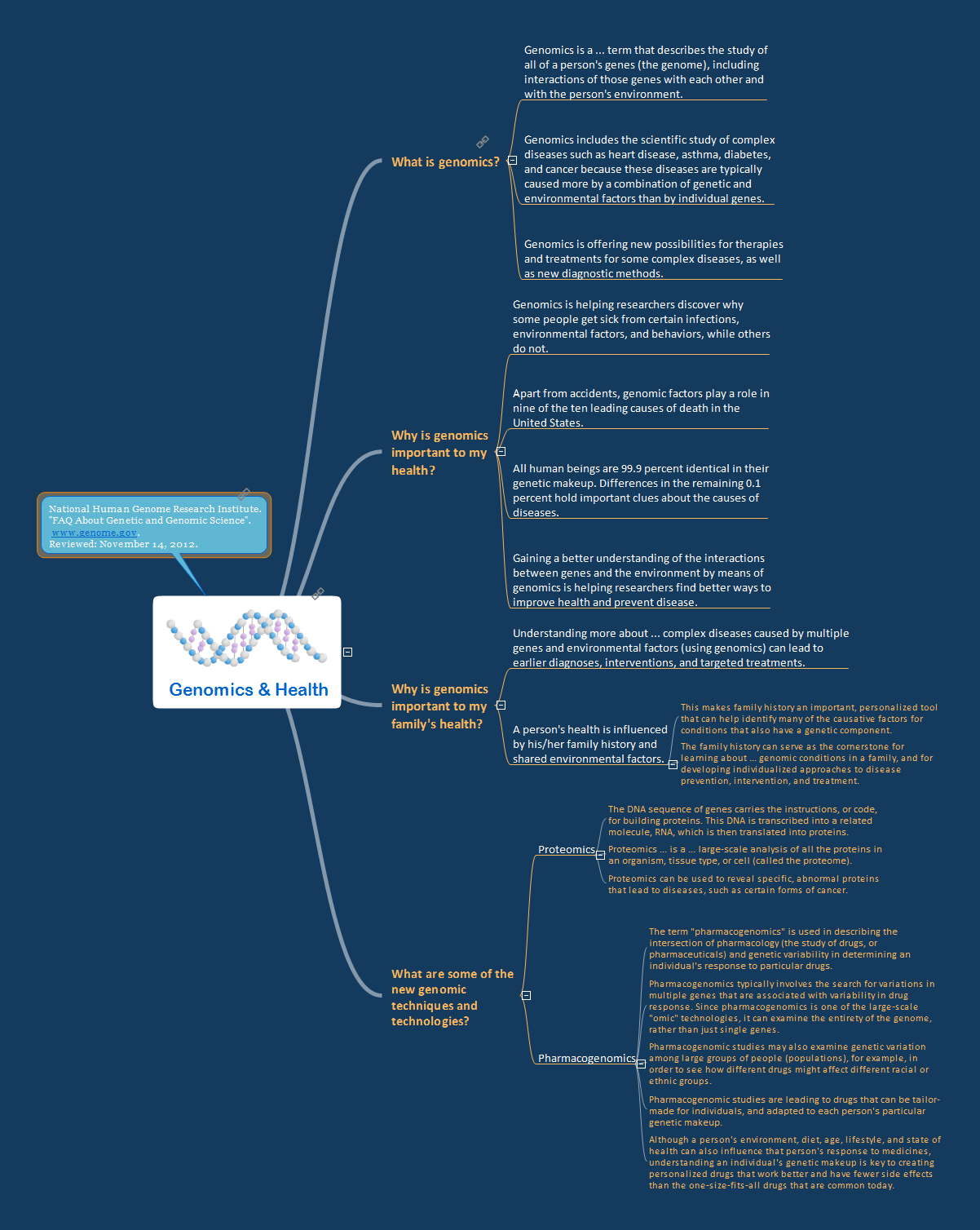 This map was created from content found at "FAQ About Genetic and Genomic Science" (National Human Genome Research Institute, www.genome.gov) and shows how simple in is to use a map structure to explain complex subjects. The content from this map and maps similar to this can be used with the eLearning for Skype solution for ConceptDraw MINDMAP to present complex information in a simplified manner.