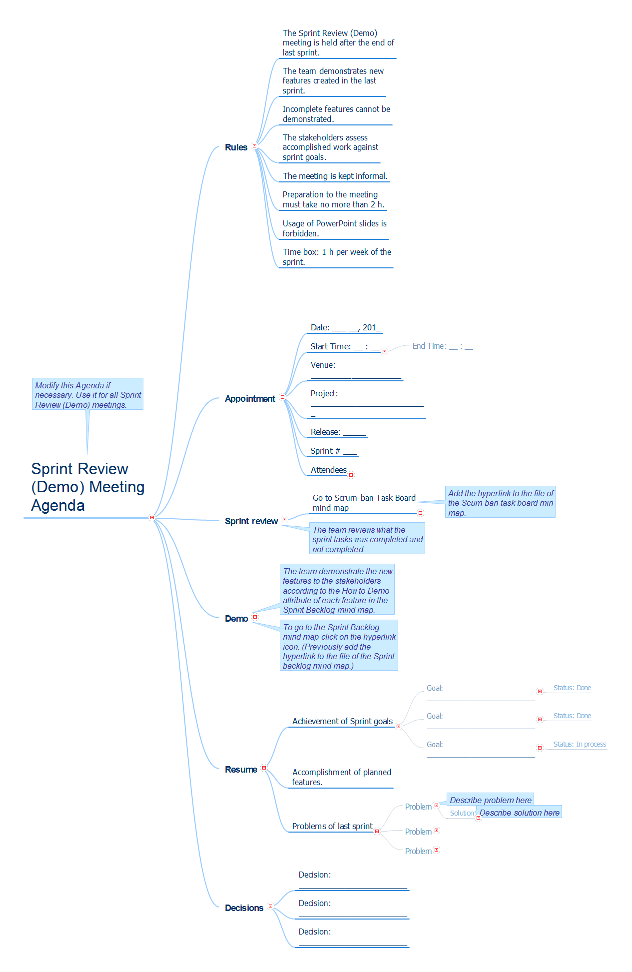 Project ManagementIn PM solutions we support many project methodologies such as Agile and Simple Projects. Methodology solutions help in implementing best practices in project management. CS Odessa provides Toolbox solutions to support solving issues related to planning, tracking, milestones, events, resource usage, and other typical project management functions. Toolbox Solutions help you deal with common project situations in an extraordinary way. PM MeetingsBenefitsPM Meeting makes preparing for meetings a quick task. Meetings become more efficient because of the ability to easily record results. Collaborative decisions made by the project team are captured as part of the meeting process and then distributed. This innovative process makes meetings more productive and keeps activities on track. Meeting notes can be easily distributed at a meeting's conclusion to all participants and stakeholders. ObjectivePrepare project meetings quickly, keep meetings on track, organize team brainstorming, record brainstorming results, and share meeting results. Solution PurposeEasily prepare for regular meetings using templates provided in ConceptDraw MINDMAP Brainstorm ideas, track meeting agendas, collaboratively edit, and easily share meeting results. Intended ForProject manager, team leaders, and meeting organizers Products and MethodsUsing mind maps changes boring meetings into a work space for creative and productive work for the entire team. MS Word
