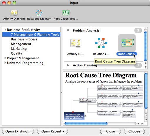 - From Output tab, under "7 Management & Planning Tools", select Root Cause Tree Diagram