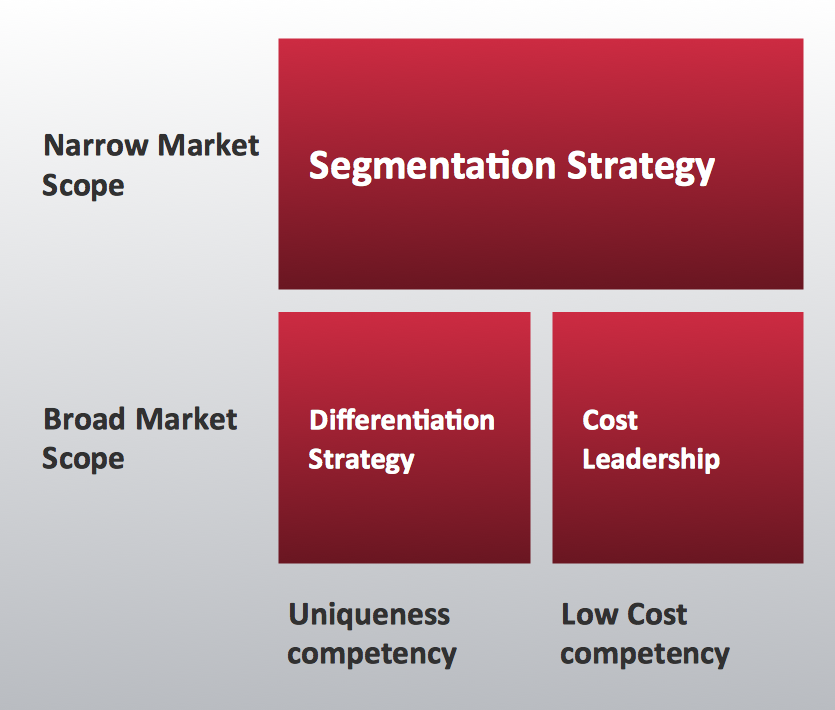 The available pre-made examples of the matrices, including the Porter's Value Chain’s one can be found in the mentioned solution. It also allows creating an Ansoff matrix, a BCG matrix, a Competitive strategies matrix, a Four-quadrant matrix, a Chore chart, a Flow process chart, a Quality function deployment matrix, a Positioning map and Porter’s generic strategies matrix being based on the templates given within the Matrices solution.