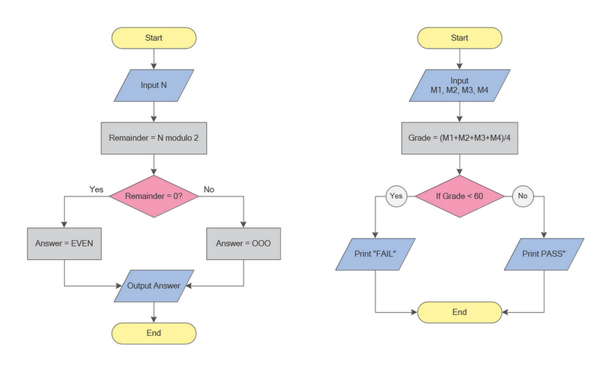 These simple flowchart examples demonstrate how standard symbols such as start/end, input/output, process, and decision are combined to describe logical workflows. They help readers see how individual shapes work together before moving to more complex process diagrams.