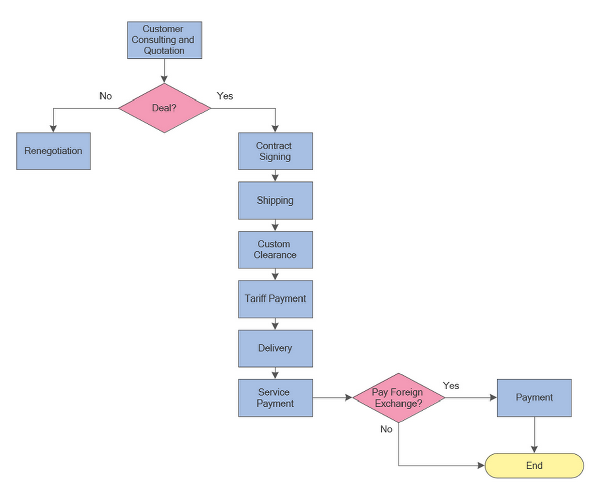 This process workflow example shows how process symbols can describe a real business sequence from customer consultation to payment completion. It is more process-focused than a basic algorithm flowchart and helps illustrate the operational use of decisions, process steps, and workflow direction.