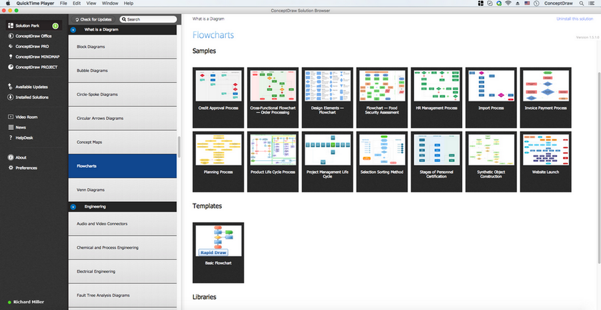 The Flowcharts Solution includes symbol libraries and reusable templates for building process flow diagrams in a structured desktop environment.