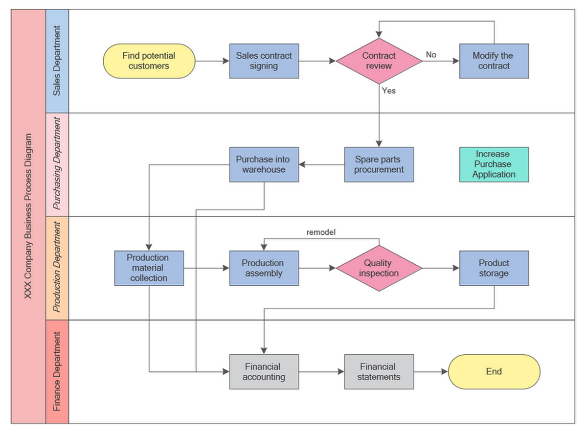 This swimlane diagram demonstrates how process flowchart symbols can be used in a larger operational environment involving multiple departments. It helps explain how handoffs, decisions, procurement, production, and finance steps can all be represented within one structured business process map.